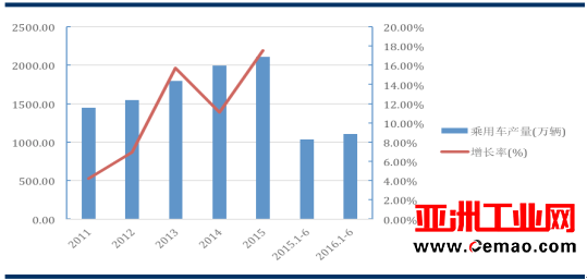 2011~2016 年 1-6 月乘用(yong)車産量與增(zēng)長率