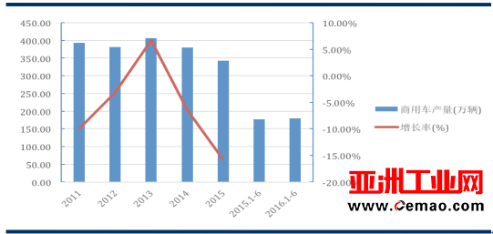 2011~2016 年(nian) 1-6 月商用車産(chǎn)量與增長率(lǜ)